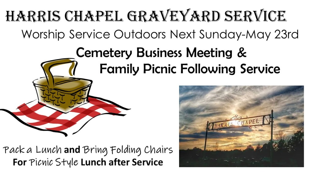 This next Sunday, regular services will be postponed until the following week in order to Host the families of Harris Chapel Graveyard for Services – Starting at 11:00am with Brief Business Meeting and a Message to Follow. Pack your family a Picnic and stay and fellowship a while. (All services will be outside – No Sunday school on this day)